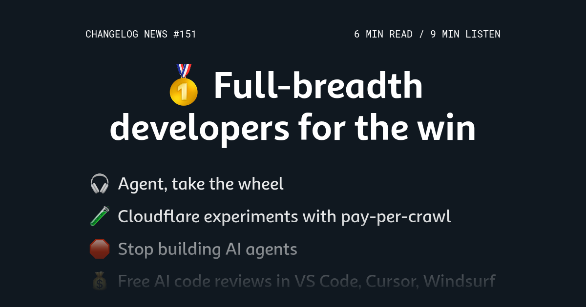 Justin Searls describes the "full-breadth developer" and why they'll win because AI, Cloudflare comes up with a way publishers can charge crawlers for access, Hugo Bowne-Anderson explains why building