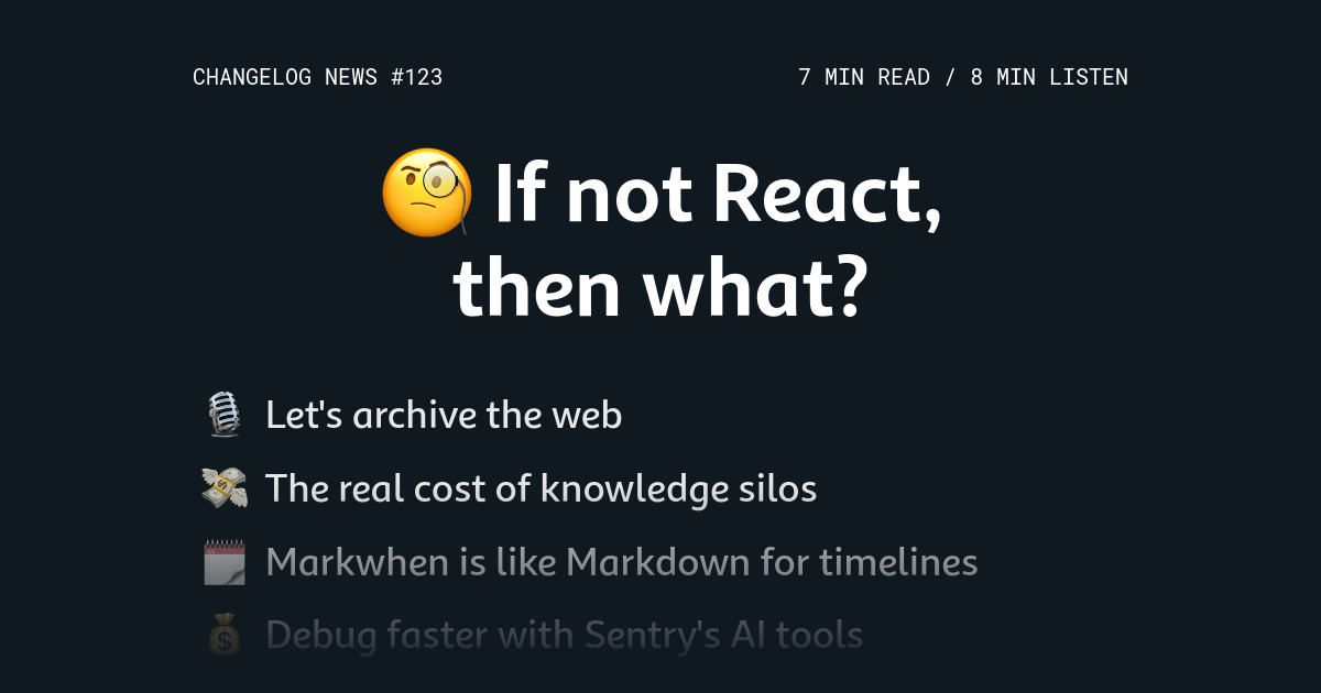 Alex Russell answers the question, "If not React, then what?" Csaba Okrona identifies four core problems that create and reinforce knowledge silos, Rob Koch's Markwhen is like Markdown for timelines,