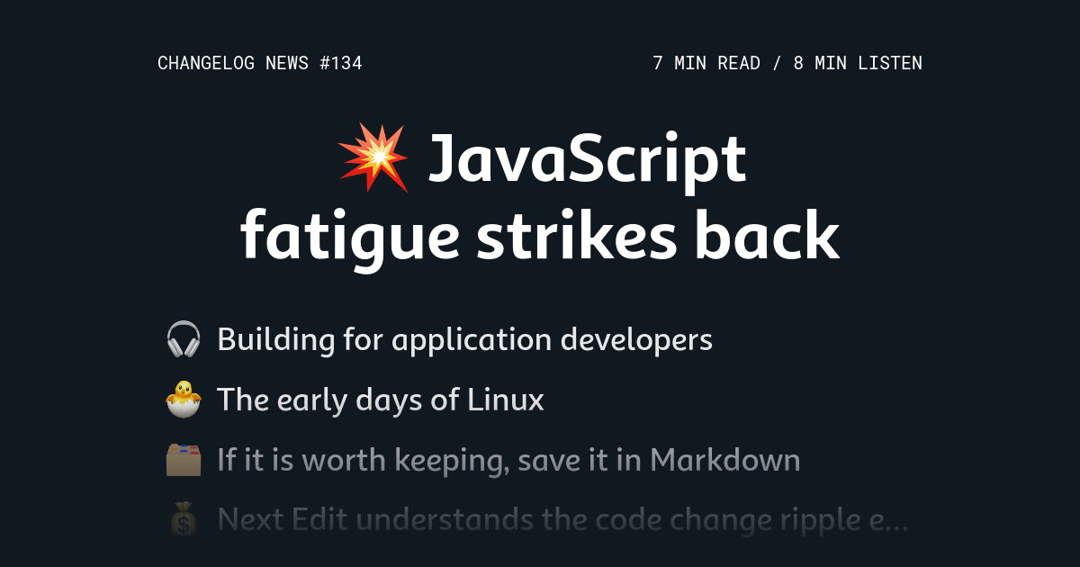 Allen Pike on the JavaScript ecosystem after a decade away, Lars Wirzenius was there at the birth of Linux, Piotr Migdał archives things in Markdown, Jacob Stopak is gamifying Git with Devlands & Juan