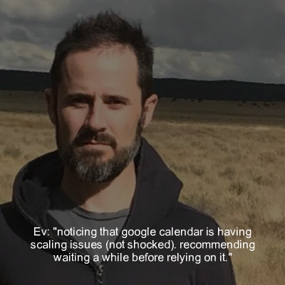 noticing that google calendar is having scaling issues (not shocked). recommending waiting a while before relying on it.